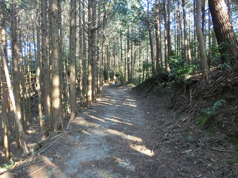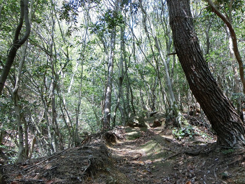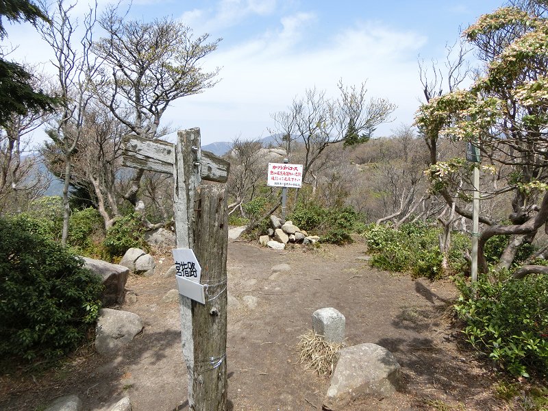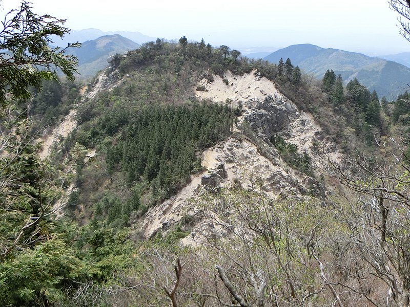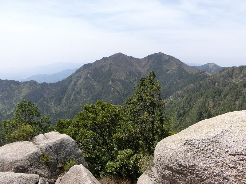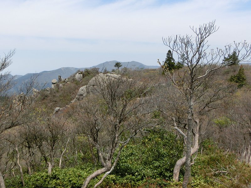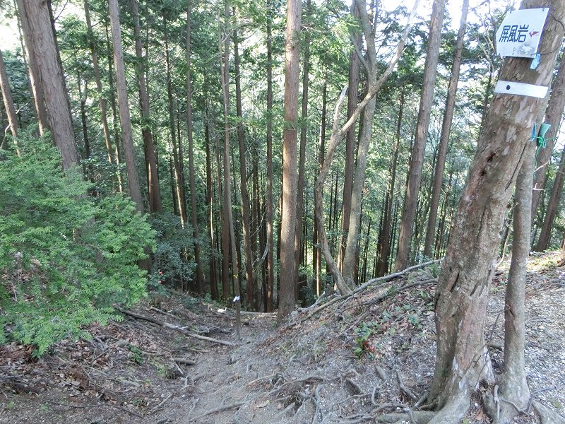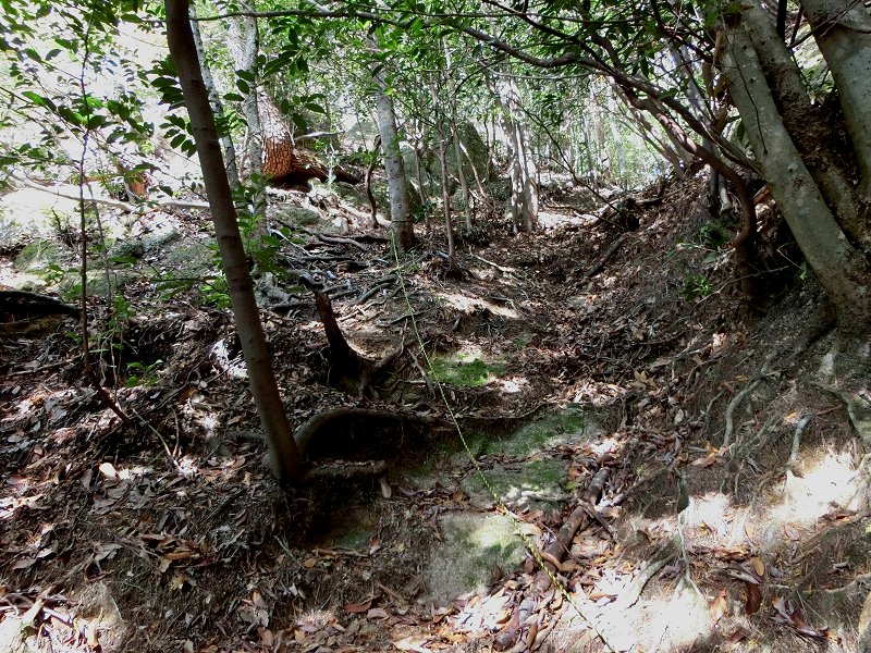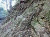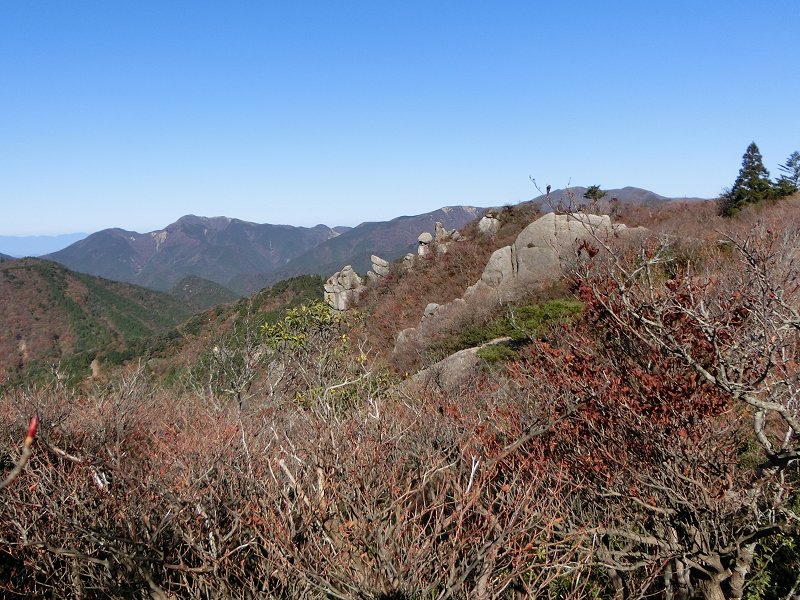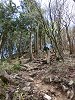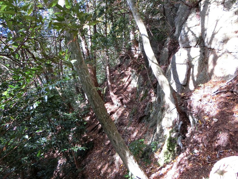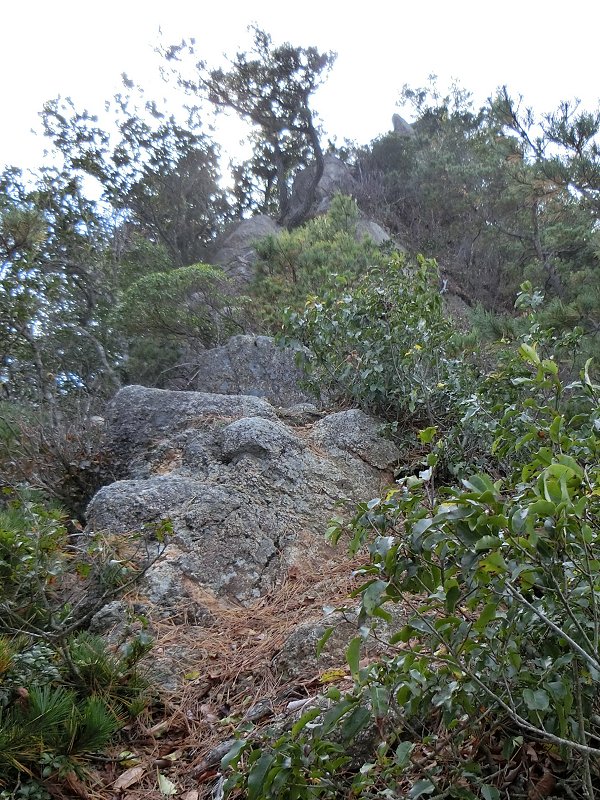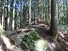 最後のピークの手前で左に90度折れ、アセビの間を抜け緩斜面を下る。直ぐ薄暗い植林になり、道は不鮮明で解りにくい。植林を抜けると大きく開けた鞍部に出、今度はここを右に進む。左は崖に近い急斜面、右は殆ど植林で、小さなアップダウンを繰り返し、臼杵岳まで続く。途中の舟石は展望も良く、休憩に最適なところ。