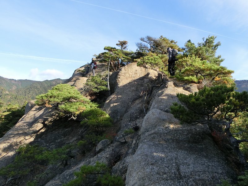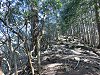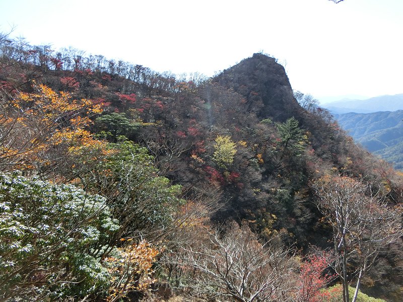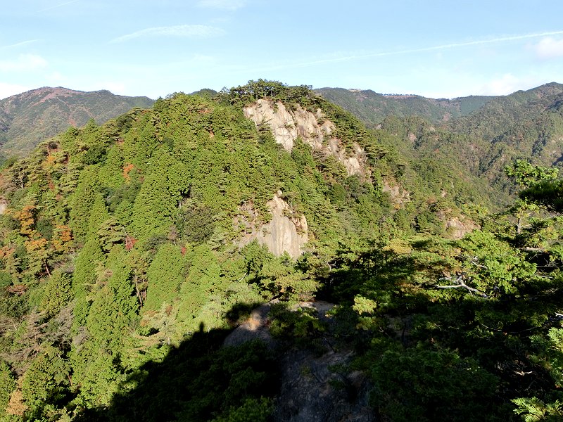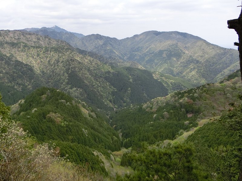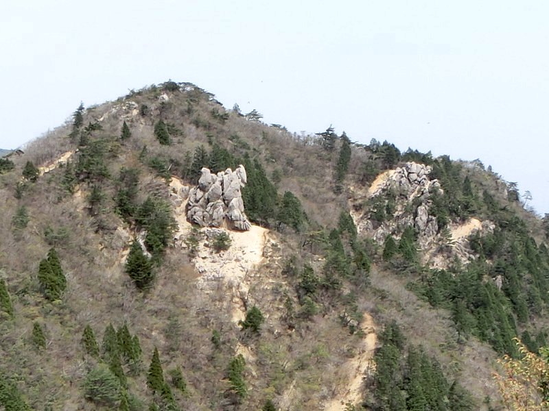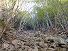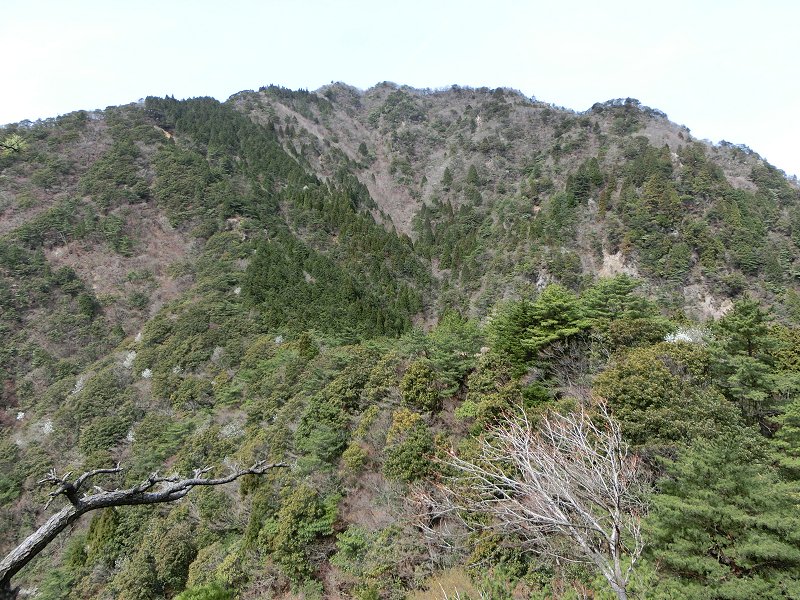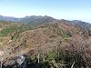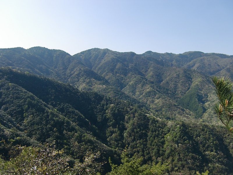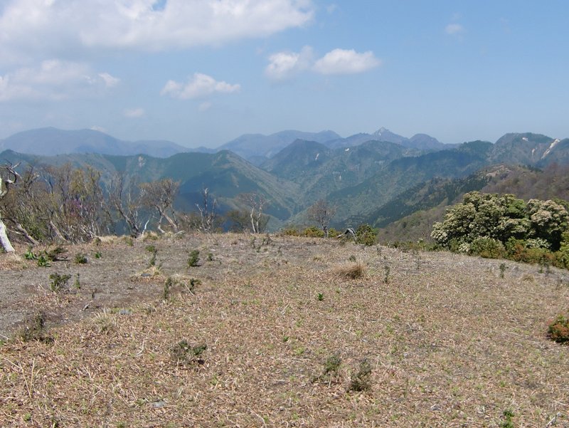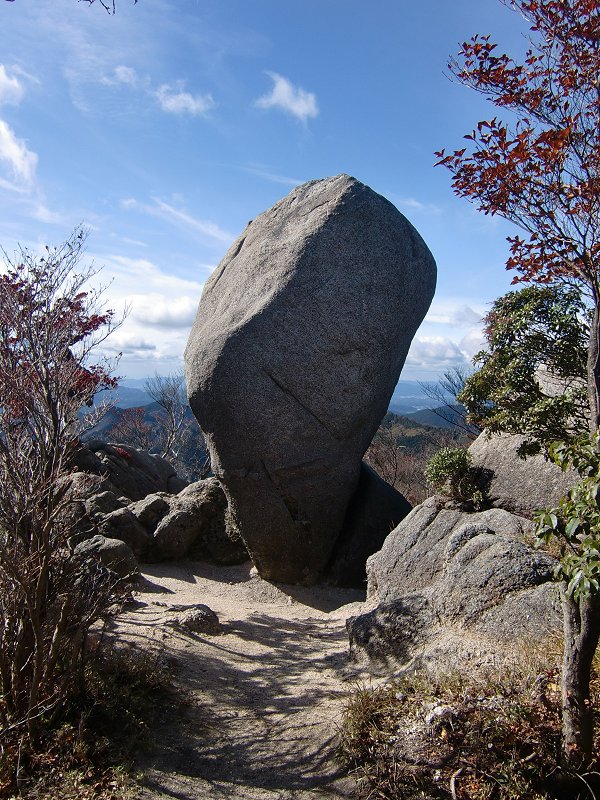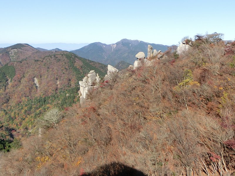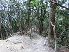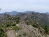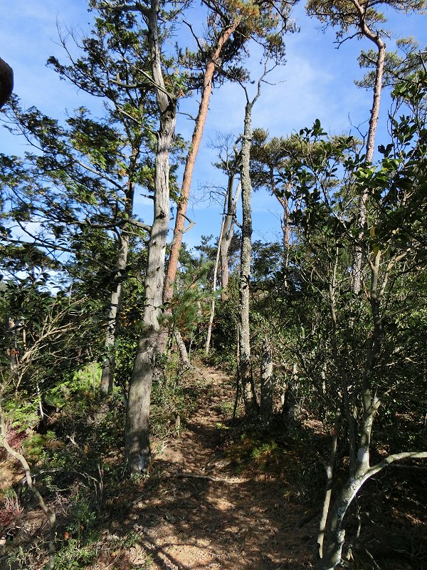 最後のピークの手前で左に90度折れ、アセビの間を抜け緩斜面を下る。直ぐ薄暗い植林になり、道は不鮮明で解りにくい。植林を抜けると大きく開けた鞍部に出、今度はここを右に進む。左は崖に近い急斜面、右は殆ど植林で、小さなアップダウンを繰り返し、臼杵岳まで続く。途中の舟石は展望も良く、休憩に最適なところ。