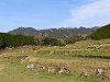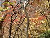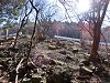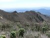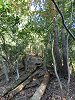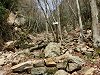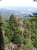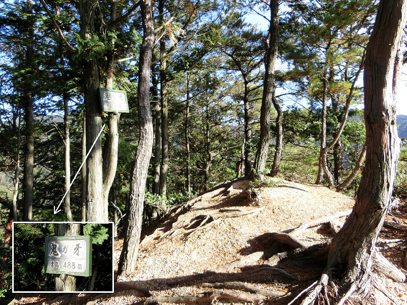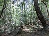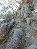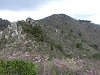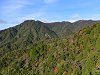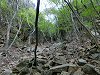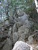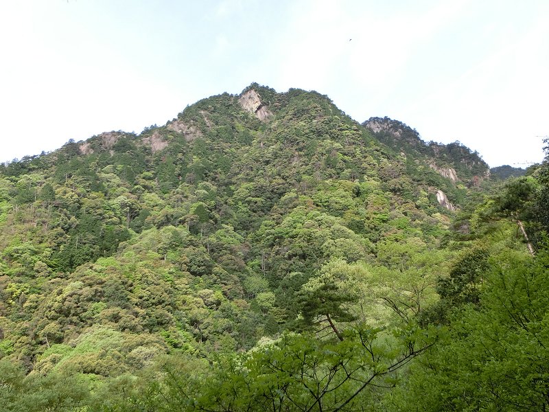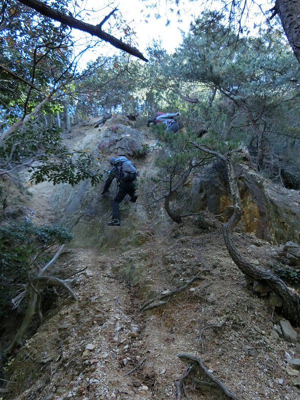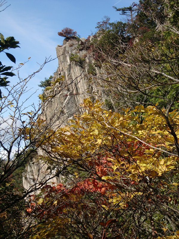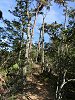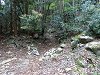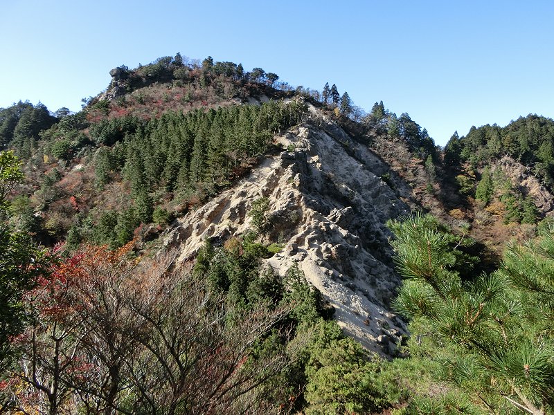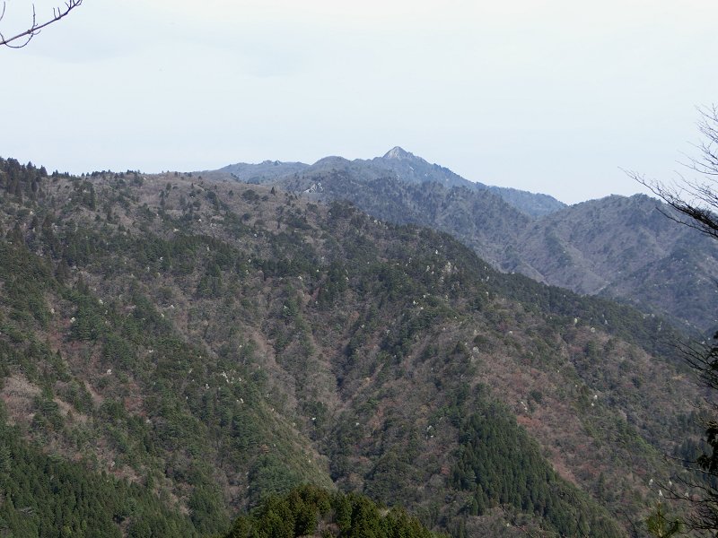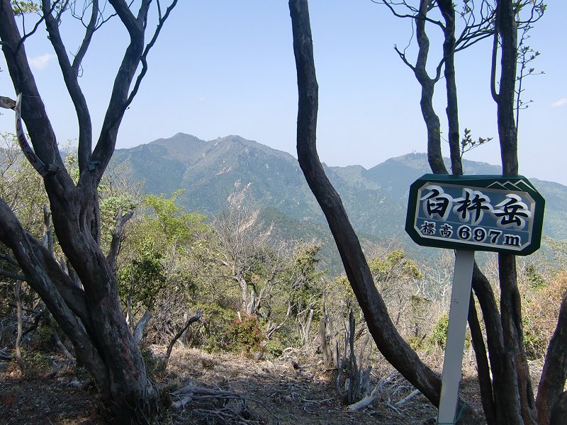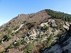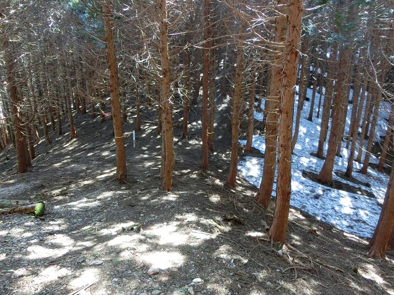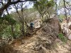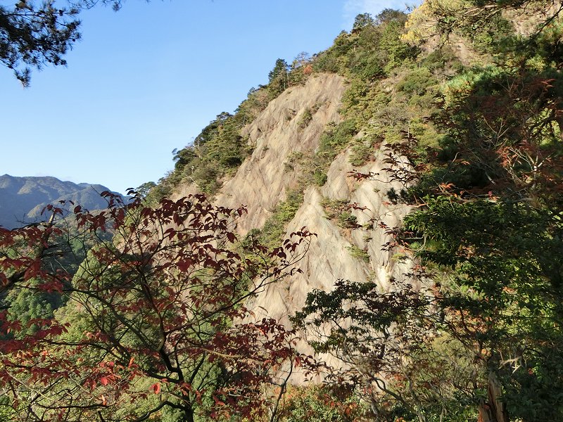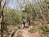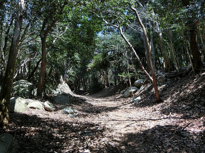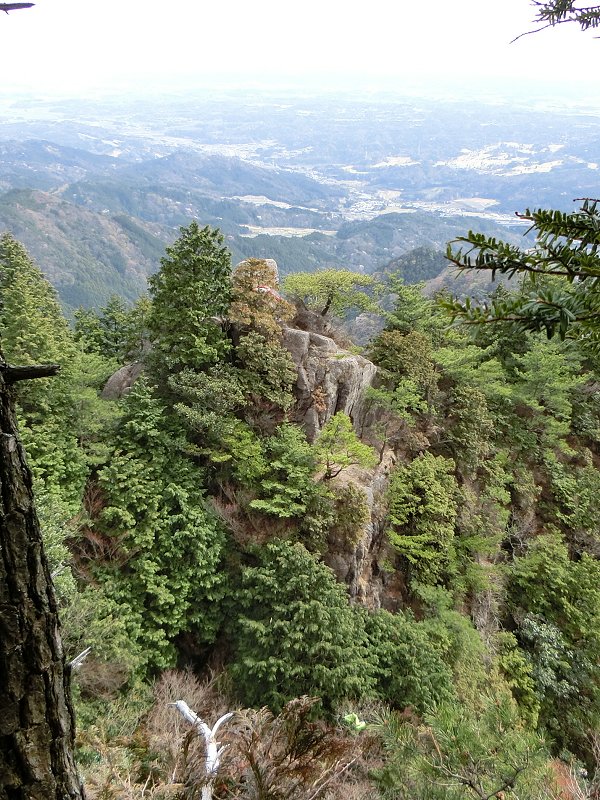 最後のピークの手前で左に90度折れ、アセビの間を抜け緩斜面を下る。直ぐ薄暗い植林になり、道は不鮮明で解りにくい。植林を抜けると大きく開けた鞍部に出、今度はここを右に進む。左は崖に近い急斜面、右は殆ど植林で、小さなアップダウンを繰り返し、臼杵岳まで続く。途中の舟石は展望も良く、休憩に最適なところ。
