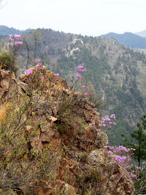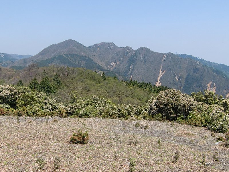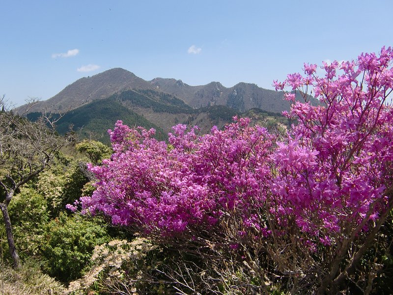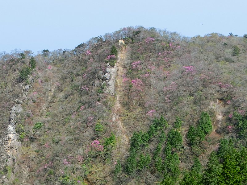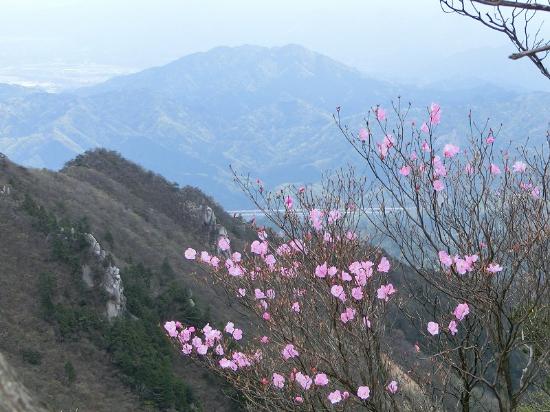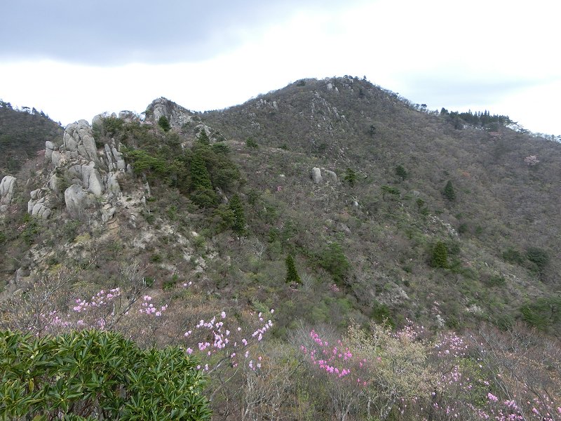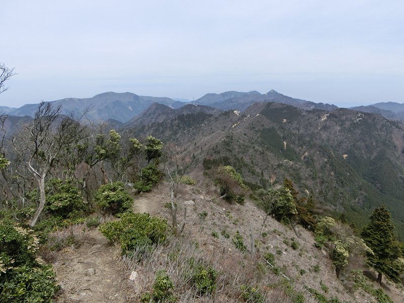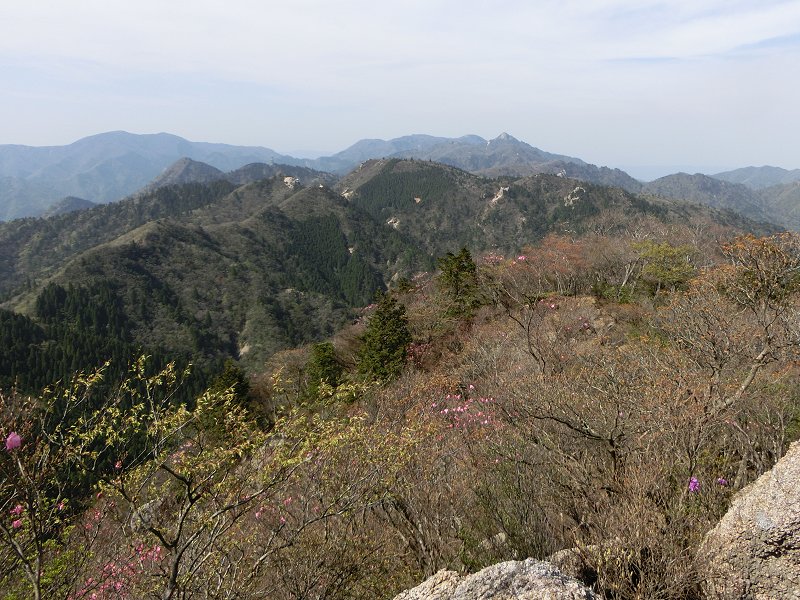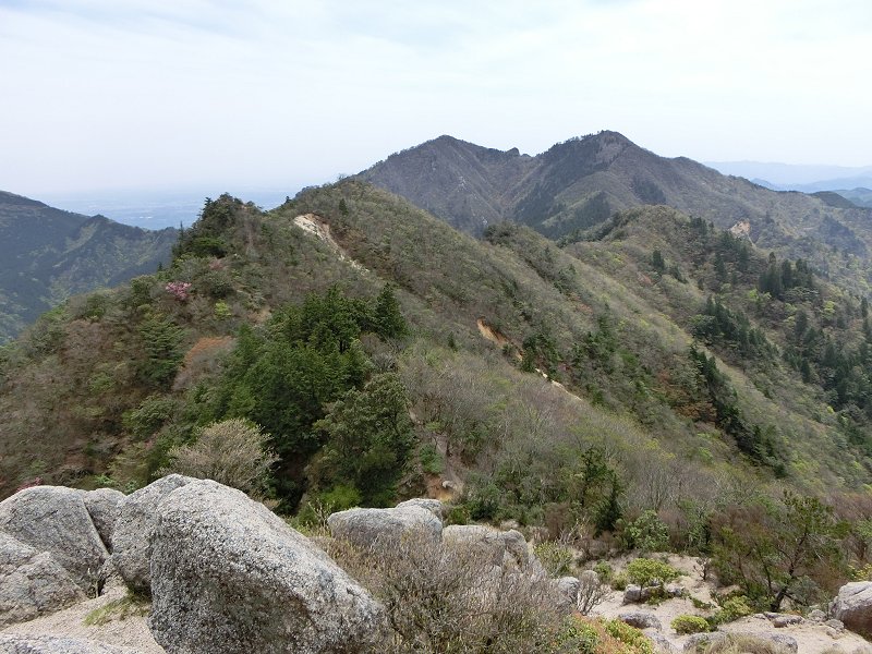 南尾根は大小のピークが連続し、岩場もあって一見険しそうに思えるが、しっかりと道はつけられており、緊張するような箇所はあまりない。各ピークからの眺めは非常に良く、今日は斜面を彩るアカヤシオの眺めは格別だ。頂上からは今まで歩いて来た南尾根の全貌が、また北には御在所岳や鎌ヶ岳など、展望は非常に良い。