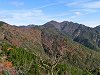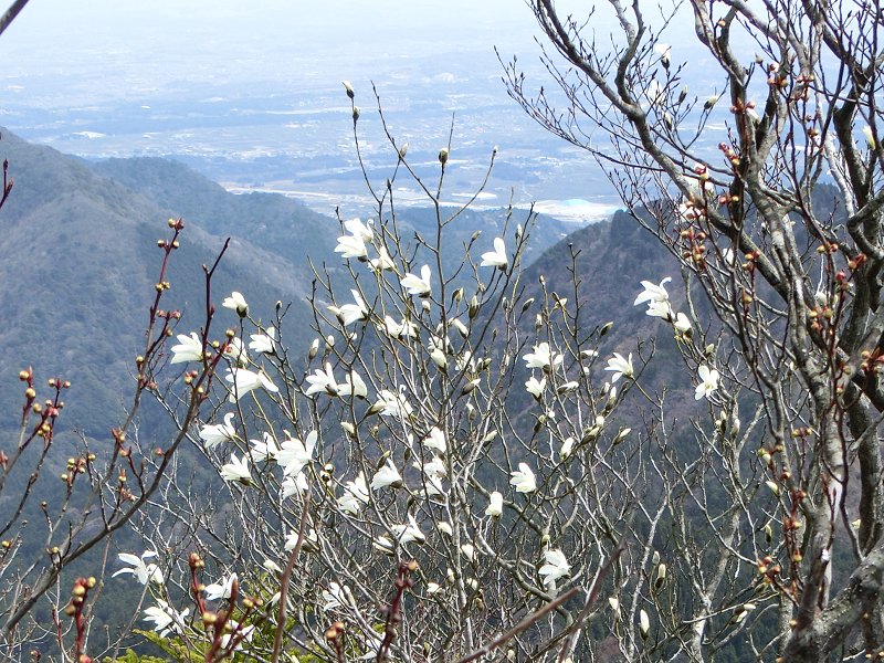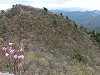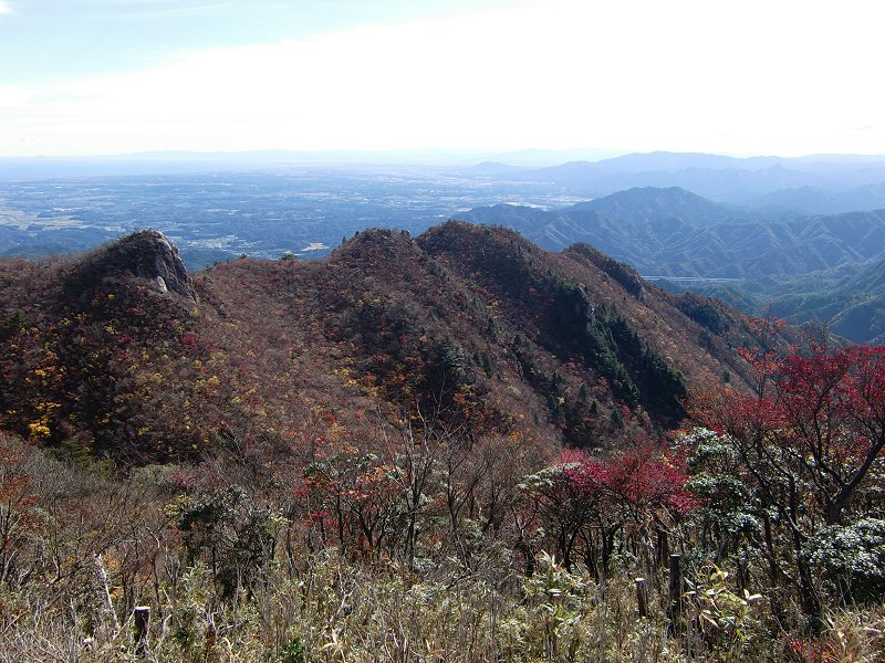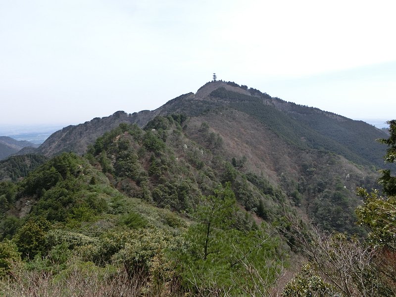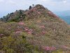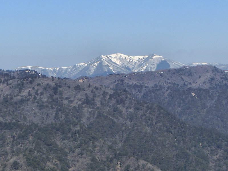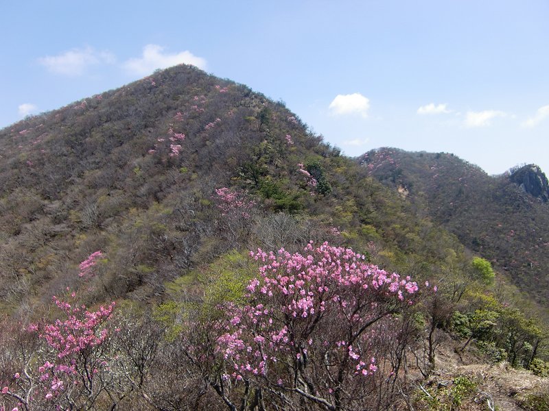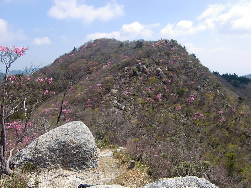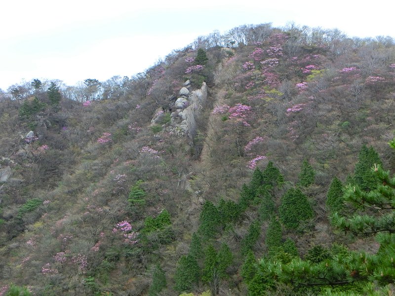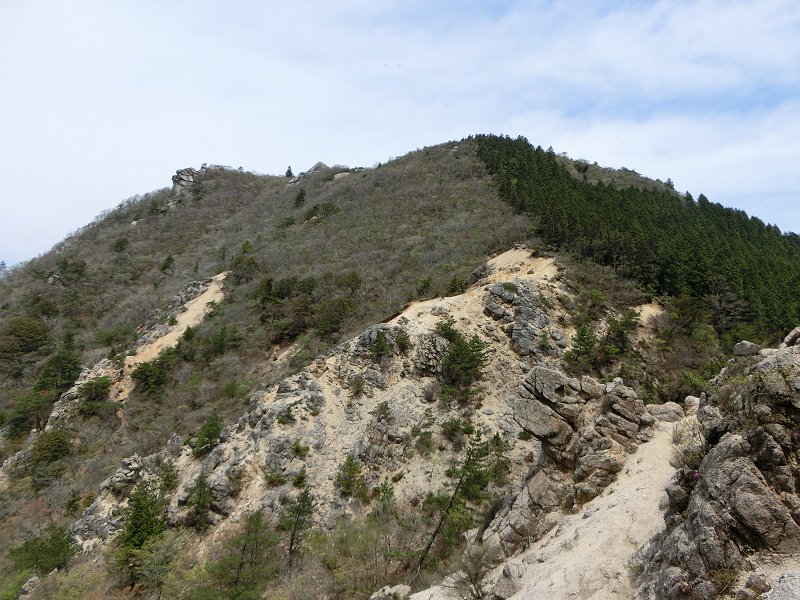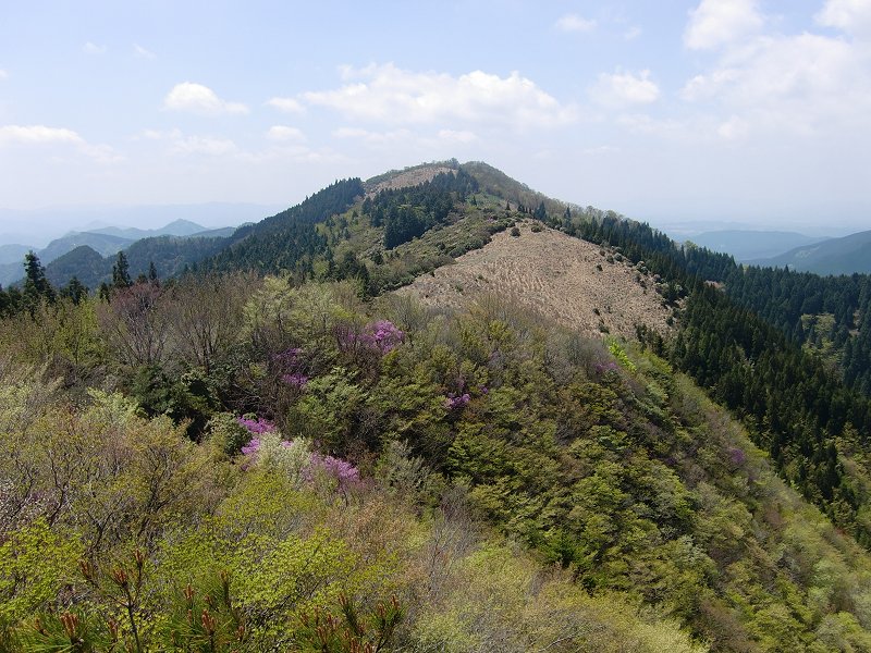 南尾根は大小のピークが連続し、岩場もあって一見険しそうに思えるが、しっかりと道はつけられており、緊張するような箇所はあまりない。各ピークからの眺めは非常に良く、今日は斜面を彩るアカヤシオの眺めは格別だ。頂上からは今まで歩いて来た南尾根の全貌が、また北には御在所岳や鎌ヶ岳など、展望は非常に良い。