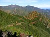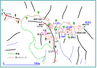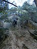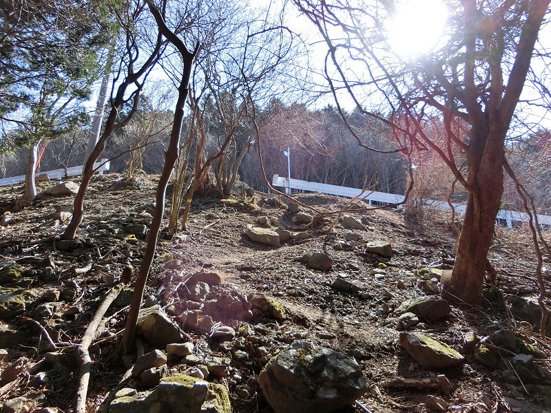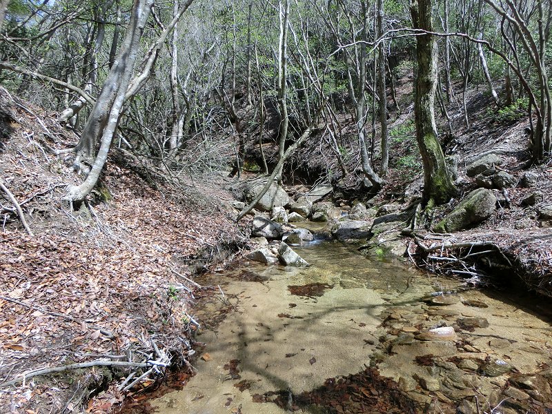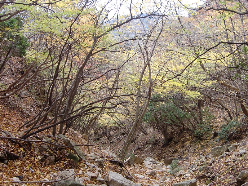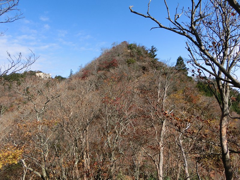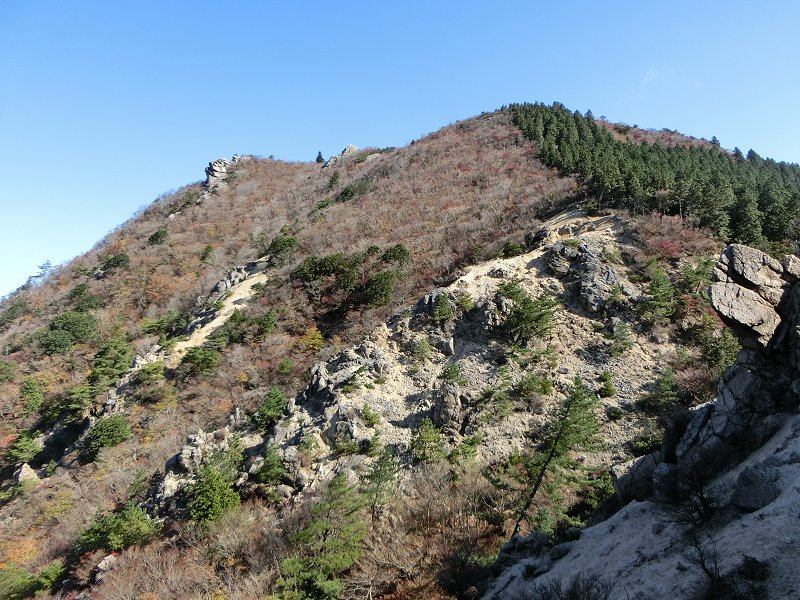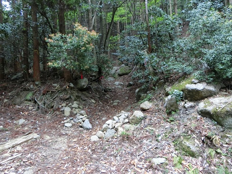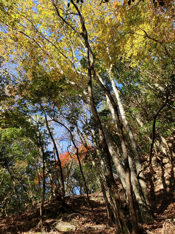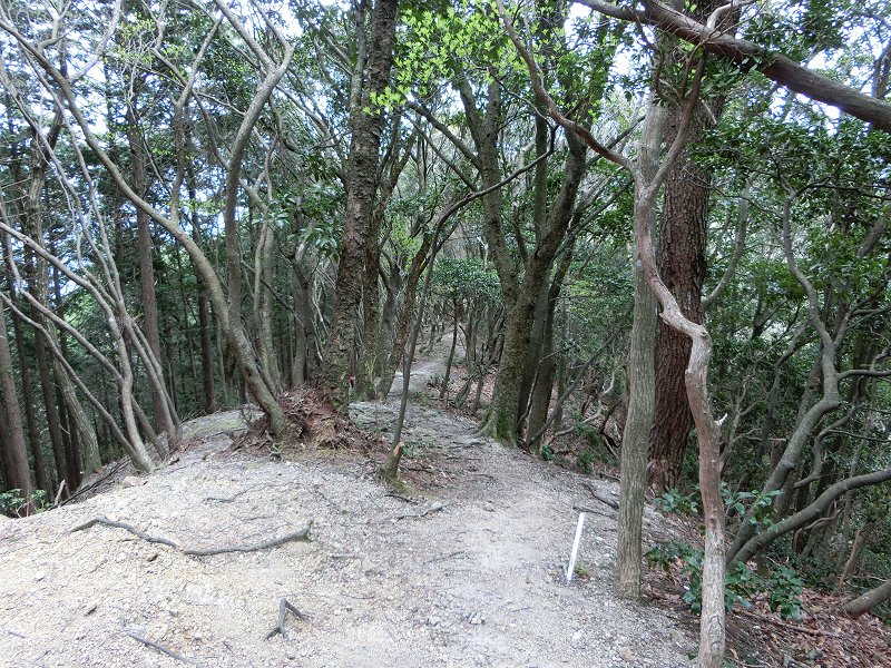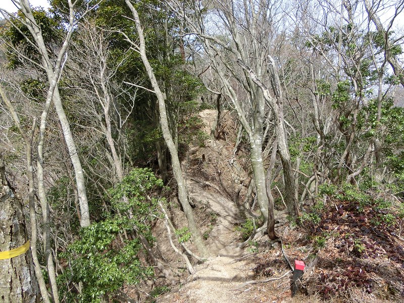 一旦御所谷の下降点となる鞍部まで約200m下ることになる。途中植林付近で紛らわしい所があるが、植林との境を歩けばコースから外れることはない。