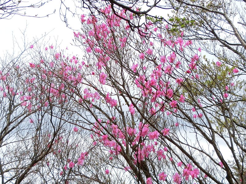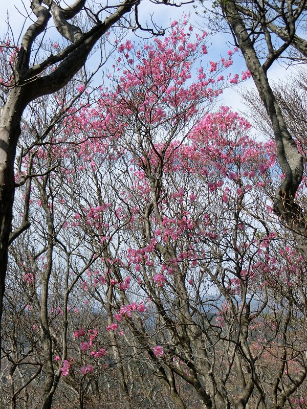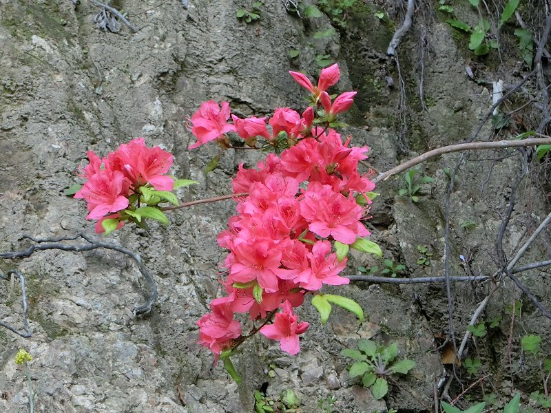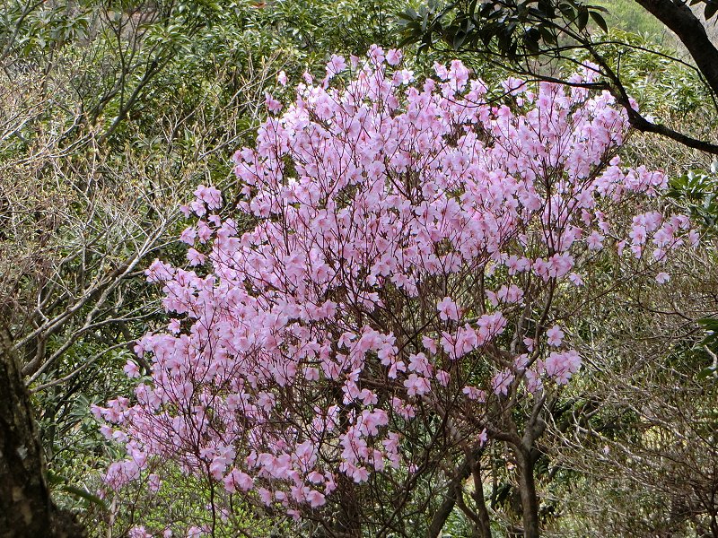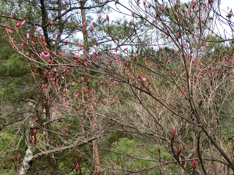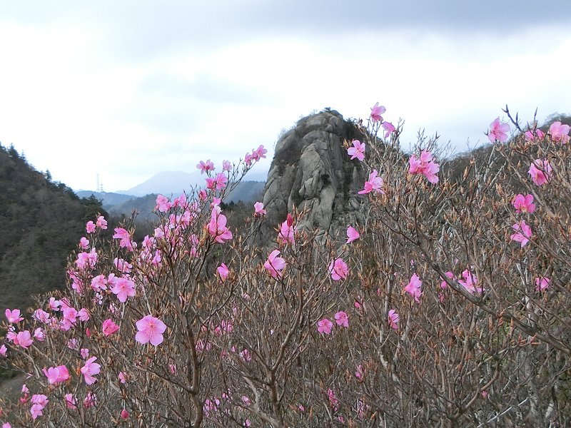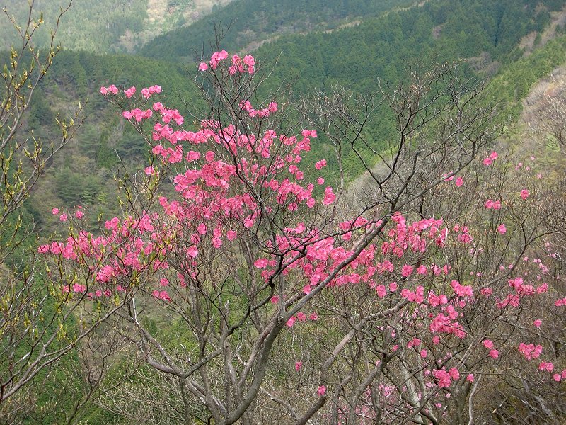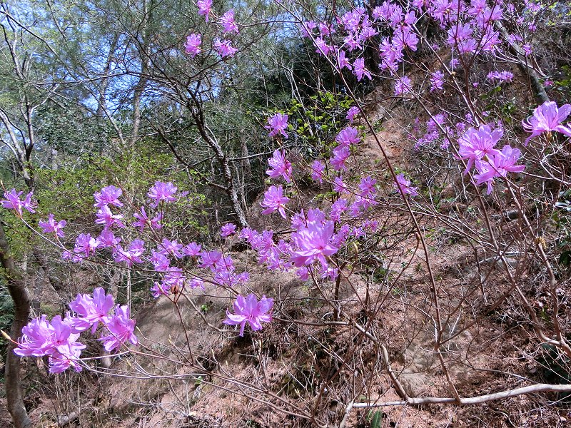 廃屋となった造林小屋近くまでは林道歩く。途中一箇所大きな落石が道を塞いでいたが、通過には全く支障はない。廃屋前で白谷コースと滝谷不動(南尾根コース)の分岐があり、滝谷不動方向に進む。道は水量は少ない谷を何度も渡り返す。水が涸れると傾斜もきつくなり、南尾根から東に延びる尾根に突き上げる。右へほんの僅かで滝谷不動へ、左の固定ロープの岩場を上がれば、南尾根通じている。この付近からアケボノツツジが現れるが、既に落下が始まっている。