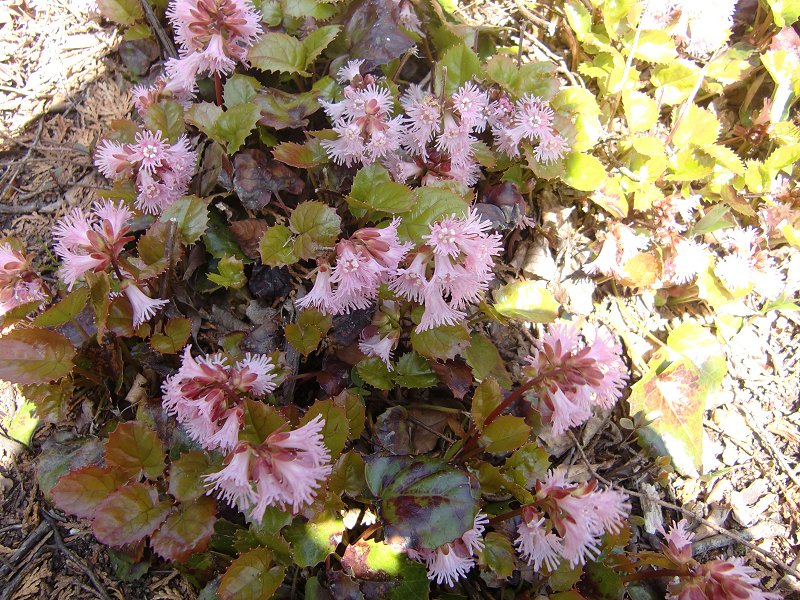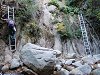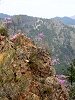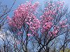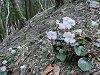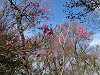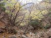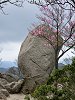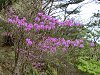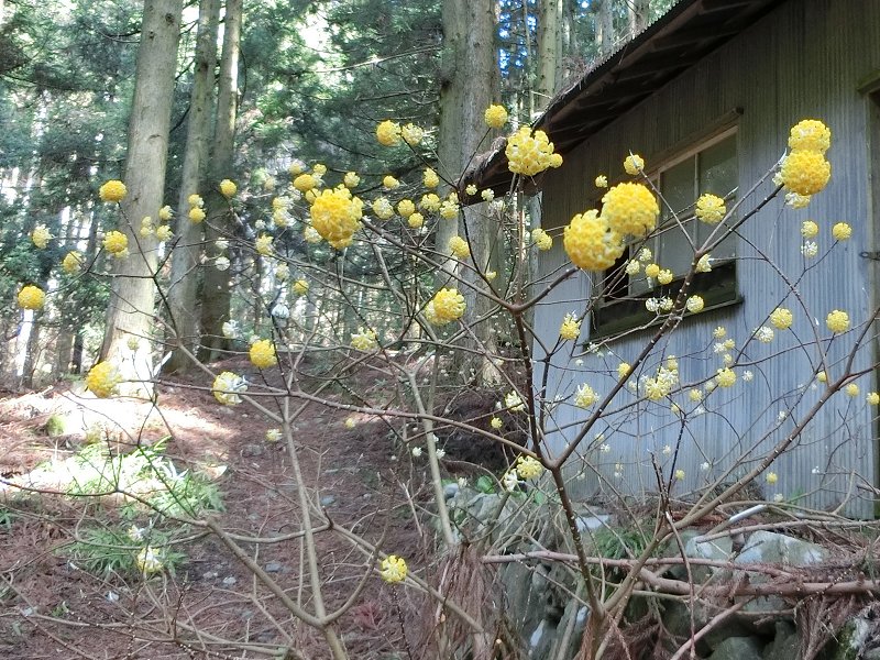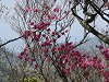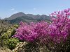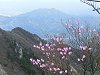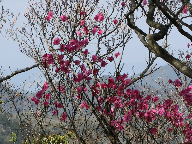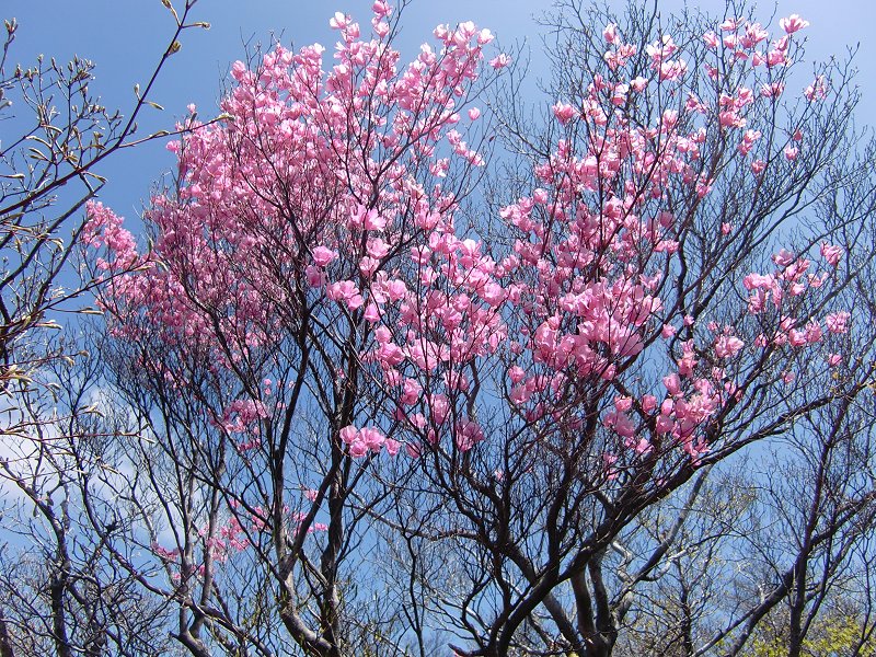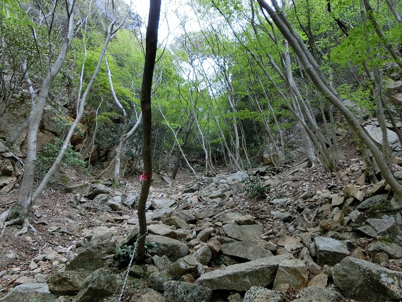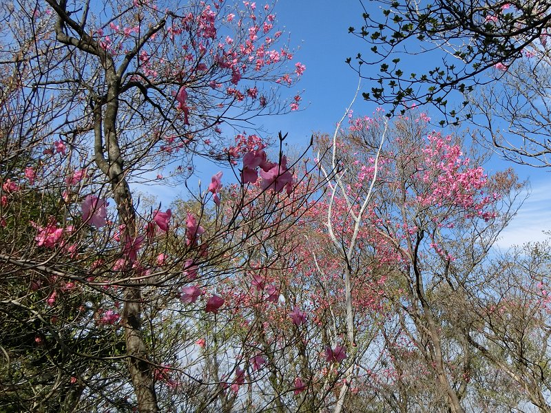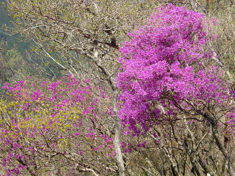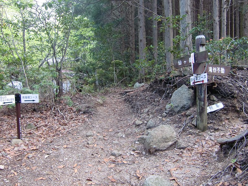 廃屋となった造林小屋近くまでは林道歩く。途中一箇所大きな落石が道を塞いでいたが、通過には全く支障はない。廃屋前で白谷コースと滝谷不動(南尾根コース)の分岐があり、滝谷不動方向に進む。道は水量は少ない谷を何度も渡り返す。水が涸れると傾斜もきつくなり、南尾根から東に延びる尾根に突き上げる。右へほんの僅かで滝谷不動へ、左の固定ロープの岩場を上がれば、南尾根通じている。この付近からアケボノツツジが現れるが、既に落下が始まっている。