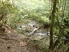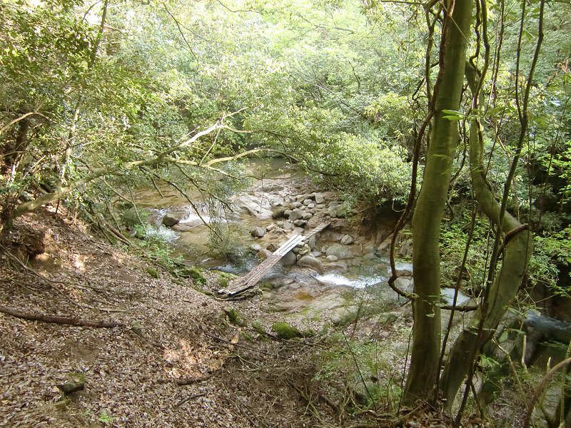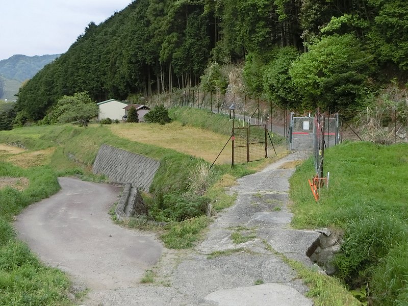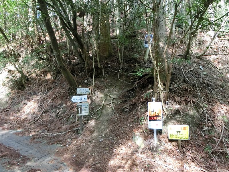 トイレの上手でバンガロー村の前から植林内の道を上がる。道は尾根を大きく回り込んでいるようだが、ショートカットで尾根を越える道もあり、後者を利用する。石谷川に架けられた簡単な橋?を渡り、林道に上がったところに第二堰堤上の林道駐車スペースがある。車は此処までで、これから先には侵入出来ない。