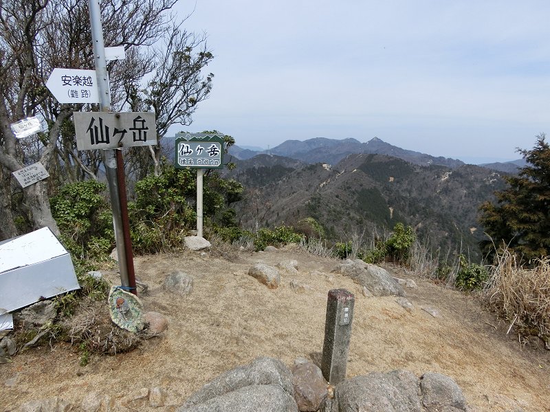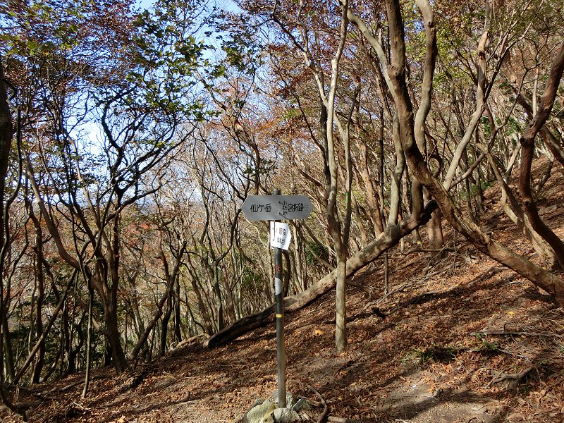 駐車地8:08−−(2)−−8:10ヤケギ谷登山口−−(120)−−10:25東海展望10:36−−(12)−−10:48三体仏岩11:00−−(16)−−11:16宮指路岳11:59−−(85)−−13:34小社峠−−(35)−−14:09仙ヶ岳(西峰)14:23−−(18)−−14:45仙ヶ岳(東峰)15:04−−(36)−−15:40仙鶏乗越15:52−−(48)−−16:40林道終点16:49−−(30)−−17:24駐車地