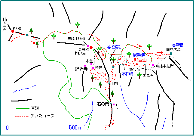 石谷川林道駐車地7:50−−(35)−−8:32南尾根コース・白谷分岐−−(55)−−9:30不動分岐・滝谷不動9:52−−(37)−−10:48約910mピーク・V峰?−−(10)−−11:08U峰?−−(12)−−11:20岩峰・T峰−−(7)−−11:32仙ノ石・東峰12:17−−(12)−−12:35仙ヶ岳13:05−−(4)−−13:09白谷分岐−−(100)−−15:00南尾根コース・白谷分岐−−(35)−−15:40石谷川林道駐車地