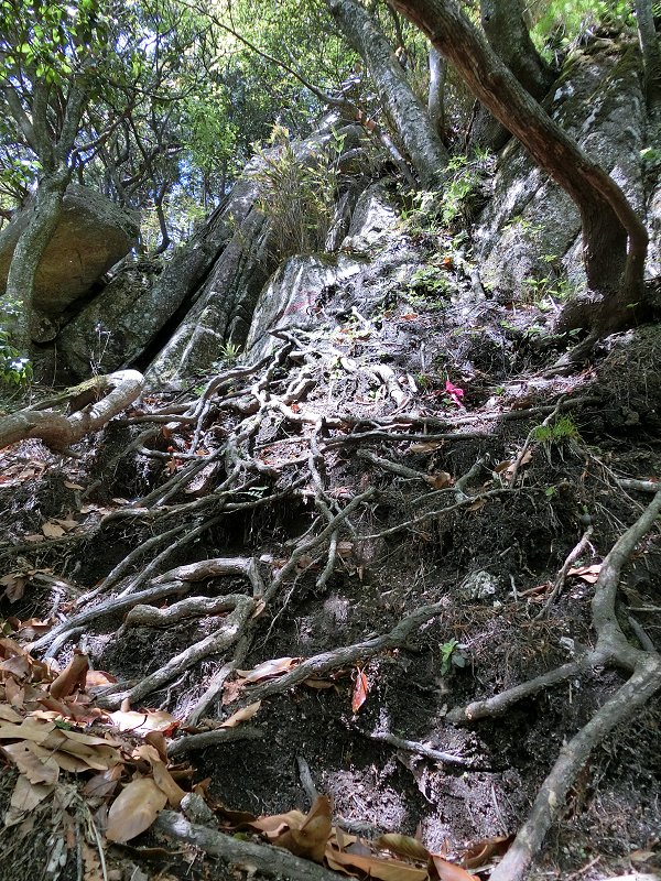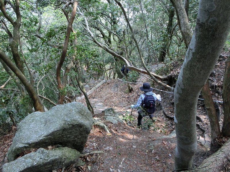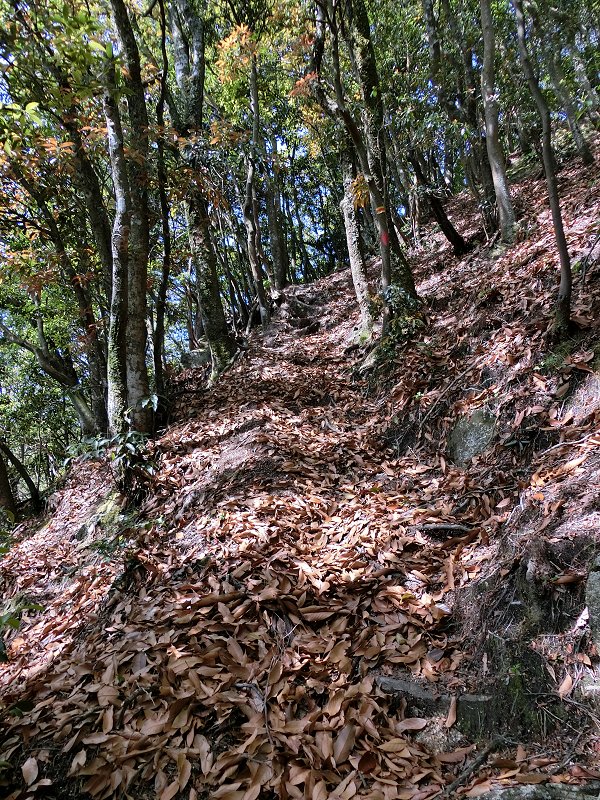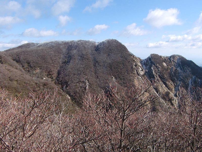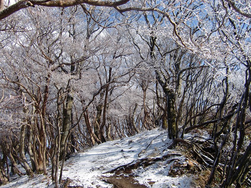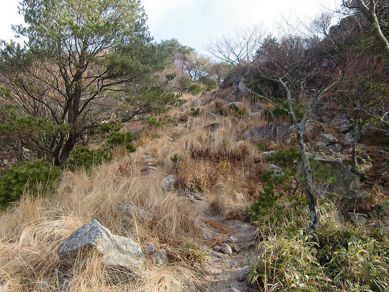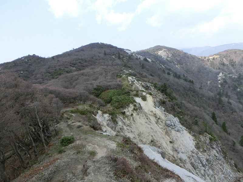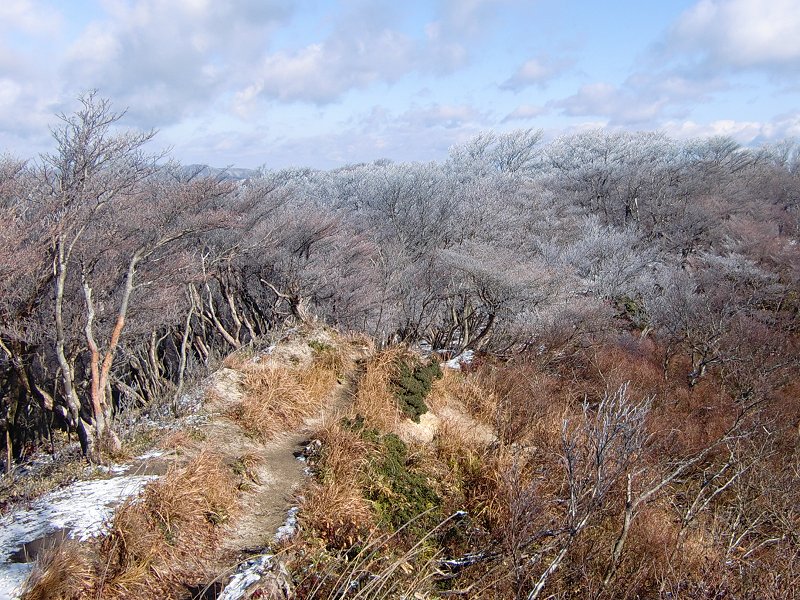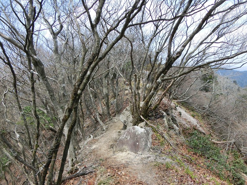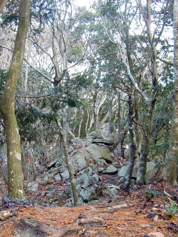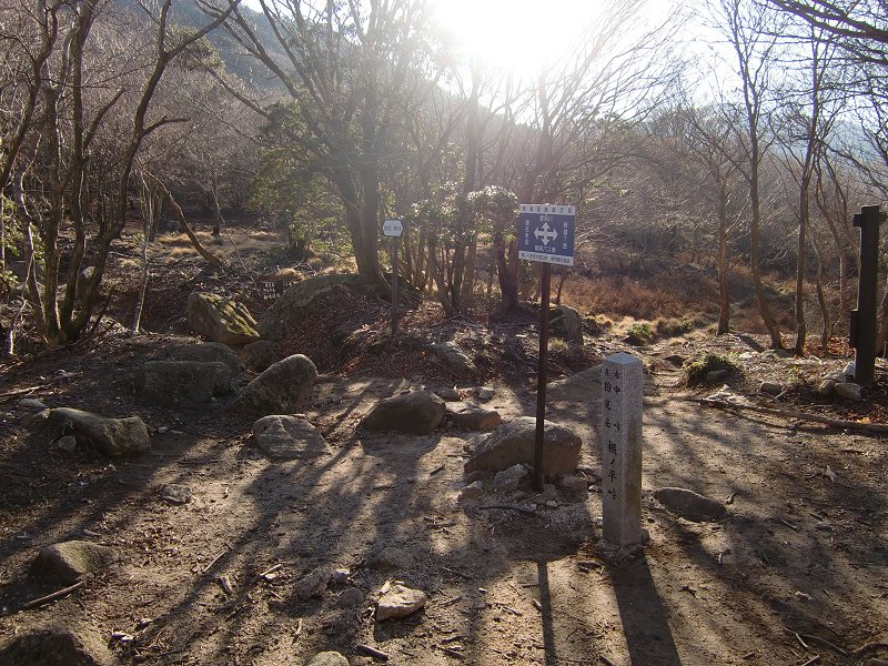 | 駐車場〜中尾根〜釈迦ヶ岳 鈴鹿の山は道標もよく整備されており、この釈迦ヶ岳も同様で、中尾根取付点へも迷うことはない。 暫く上りが続くが、周囲は明るい自然林で、気持が良い。尾根上の木々は当然葉を落とし明るく、時折木々の間に展望も得られるが、夏場であれば殆ど展望は無いだろう。唯一鳴滝コバは南に視界が開け、御在所岳方面の眺望が良い。途中露岩の痩せた尾根もあるが、特に危険性は感じない。 庵座谷分岐を過ぎると、それまでとは一変急坂が始まる。松尾尾根合流手前には岩場もあるが、迂回路もあり安全に通過できる。松尾尾根道分岐を過ぎると、正面にはキレットを挟んで最高点が迫っている。一旦ザレタ斜面を下った後、見上げるような急坂を上り詰めると釈迦ヶ岳最高点に着く。最高点は展望に優れ、休憩するにも最適だ。三角点のある頂上へは起伏は少なく、数分で付く。三角点では伊勢湾から知多半島まで、東側の展望が得られる。 釈迦ヶ岳〜根の平峠〜駐車場 三角点から猫岳を経由する県境尾根は、上りに使った中尾根とは違って、開放感のある明る尾根で、展望も良く危険な箇所も無い。また猫岳・羽鳥峰・中峠・・・等、目標となるポイントが適当な間隔であるので、テンポ良く歩ける。当然、これらのポイント間にはアップダウンはあるが、さほど大きなものではない。 当初から根の平峠を目標にしていたが、もし時間に余裕が無くなれば、羽鳥峰峠や中峠からでも下山できるのも、このコースの良いところだろう。 根の平峠からは伊勢谷に向かって下る。2度砂防ダム堰堤近くで渡渉するが、概ね左岸を歩く。地形図では谷(右岸)途中まで林道が上がっているが、豪雨による出水のため寸断しているようで、右岸の林道を歩くことはない。一旦左岸の林道に出ると、あとは荒れた箇所もなく、車道を駐車場へと戻る。 |