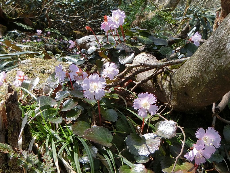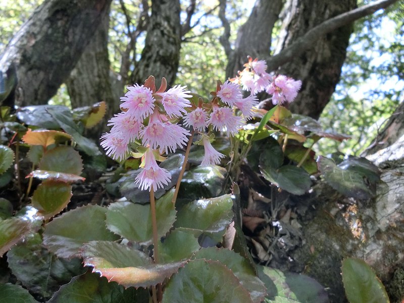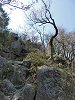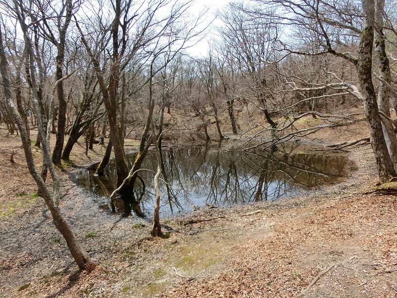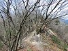 | 駐車地〜釈迦ヶ岳 駐車地から少し戻り、栃谷川沿いの林道を上流方向に2〜300m進むと、渡渉点を示すテープが有り、対岸に渡る。植林帯は短く、直ぐ常緑樹主体の尾根に変わる。序盤こそ緩やかだが、尾根は次第に傾斜もきつくなり岩稜も出現する。期待していたアカヤシオは中腹以下では落花盛んで見る影もなかったが、中腹以降は花も多く残り、まだ蕾を残した木もあり、今季初のアカヤシオを見ることが出来た。尾根は緩急を繰り返しながら高度を上げて行くが、ただ急坂部分はかなり厳しい。この尾根は頂上から北300m程の所で、縦走路(県境尾根)に出会う。 釈迦ヶ岳〜三池岳 険しかった上りの尾根に対し、縦走路は幾つものアップダウンが有るものの、何れも緩やかだ。尾根西側(左側)は概ね緩斜面で落葉樹林が広がっているが、尾根東側(右側)は急峻で樹木も少なく、その分展望も東側(右側)が優れている。 三池岳〜駐車地 頂上からお菊池までは比較的緩やかだった尾根は、お菊池を過ぎると標高差にして300m近い激しい下りが始まる。ただ登山道自体はシッカリしており、上りに使った尾根を下るより、こちらの尾根の方が下り易いように感じた。 |