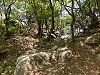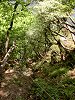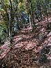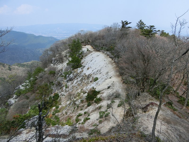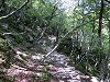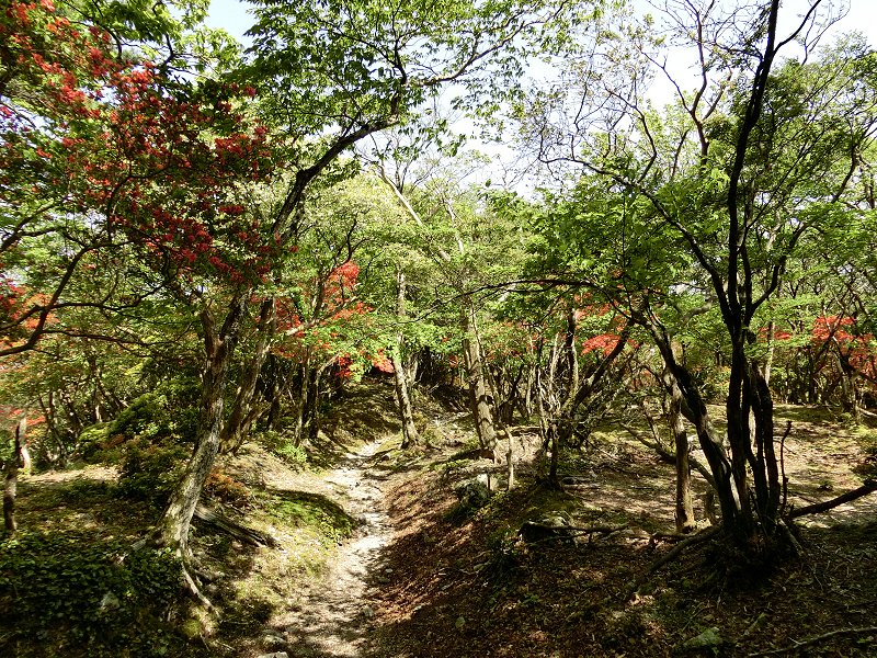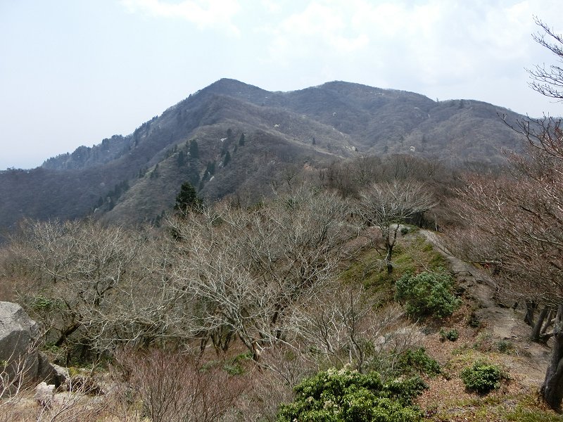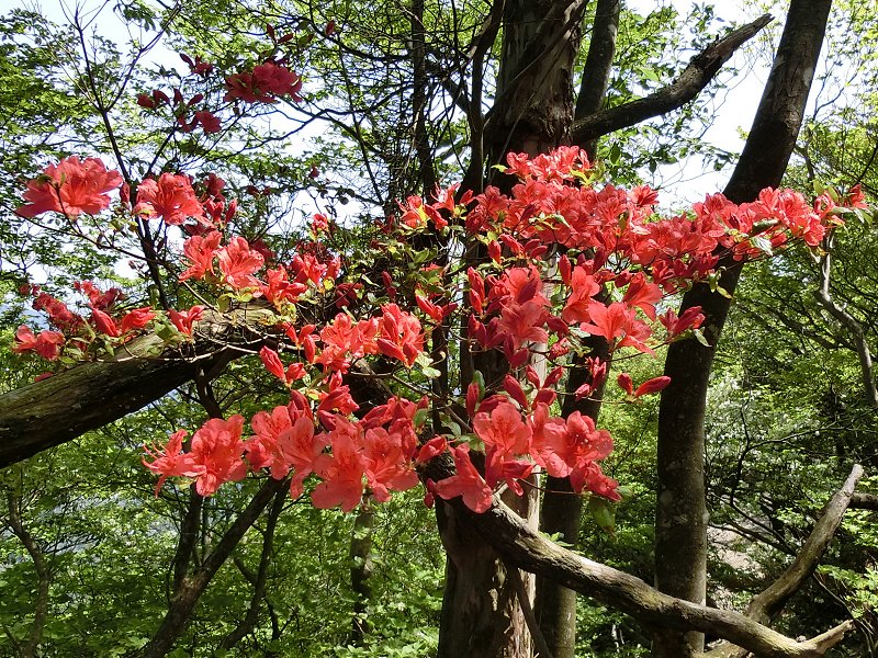 | 岩ヶ峰尾根 昨年の4月にもこの尾根を上がり、険しさを体験していたので、2度目の今回は多少は余裕をもって、上れるのではと思っていた。しかし、植林帯を抜けると、足元には常緑樹の枯れた落葉が積り、滑り易くなっている。緩やかな所はまだ良いが、急傾斜では踏ん張りが利かない。 当初、三池岳に上がり、この尾根を下ろうかとも考えていたが、こんなに滑り易い急な尾根を下るのは危険だろうと思うと共に、この尾根を下りに使わず、上りにに使ったことに安堵する。 この尾根はこの時期に限らず、下りは避けた方が良さそうだ。 八風峠・中峠登山道 八風峠までの間でシロヤシオを十分満足しため、当初の三池岳まで行く予定を変更し、八風峠で下山する。 地形図では等高線が詰んだ所が有るので、急坂を予想していたが、そのような箇所では道はつづら折りとなっており、急坂と呼べる様な箇所は全く無かった。こちらも滑り易い常緑樹の落葉が結構あったが、緩傾斜なので不安なく水晶谷へ下る。水晶谷沿いの道は何度か渡渉するようだが、最終的には左岸の林道に出るわけで、3度目に右岸に渡った後、4度目の渡渉個所を見過ごし、先に進んでしまった。間違いに気づき、4度目の渡渉箇所まで戻り、左岸に移る。以降荒れた林道を下り(一ヶ所ショートカット有り)、最奥の駐車地、三池岳登山口を経て自車駐車地に戻る。 |