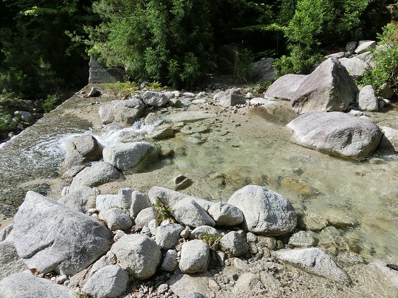| 土日だと八風キャンプ場近くの林道脇の駐車スペースも一杯になるだろうが、今日は栃谷橋近くの駐車スペースには、一台の先着車が有るのみ。尚、下山時には一つ上手の駐車スペースには6台の駐車有り。 |