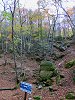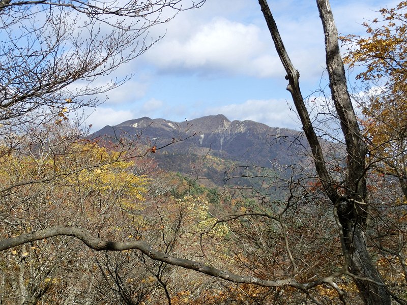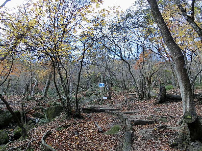 | ブナ清水コース このルートは過去1度上りに使ったことがあるが、地形図では判らない起伏も有り、地形はかなり複雑で、そのうえ落葉で踏み跡が不明瞭なところもある。目印となるテープがしっかり打たれているので、視界が良いときは迷うことは無いと思うが、ガスが出たり、夕方の薄暗くなる時間帯は避けた方が良さそうだ。 |