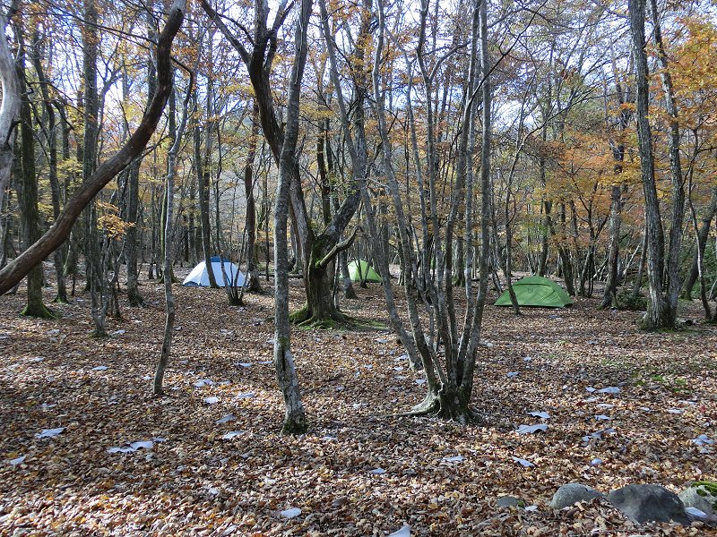 | 愛知川とブナ清水を効率的に廻る為、今回初めて、上水晶谷が愛知川に出会う辺りから東に上がる尾根を利用した。この尾根には登山道は無いが、歩かれているのはネットで知っていた。 根の平峠〜タケ谷〜愛知川(神崎川) この時期は落葉が地面を覆い、道が判りづらいのではと予想していたが、それ程でもなく、その上新しいテープも取付られていたので、問題なく愛知川に到着。なお道はタケ谷出合に突き当たる前に谷を外れ、谷出合の下流100m位の所に出る。 タケ谷〜上水晶谷(愛知川右岸) この間は殆ど平坦で、水晶谷が近くになると踏み跡が判り辛い所もあったが、流れから大きく外れないように、歩き易い所を探し進む。 テープも一部あり。 上水晶谷出合〜千草街道 距離は短いが平坦な地形で踏み跡が判り辛い。新しいテープが要所に取付られていたので、迷うことは無かったが、もしテープが無ければ地図・コンパスもしくはGPSを見る必要があったと思う。 千草街道〜尾根(バリルート)〜縦走路 千草街道が上水晶谷を渡り緩やかに上った頂点から尾根に取付く。上り始めの急坂を上り詰めた後は、何度か緩急を繰り返し、着実に高度を上げて行く。それと共に大きな岩等も現れるが、通過に支障を与えるようなことも無い。 道もハッキリしだし、そろそろ根の平峠からの縦走路に合流と思っていたところ、記憶にある様な場所を通過する。どうやら気付かない内に縦走路に合流していた。 この尾根取付き点の標高は800mを僅かに越えおり、一方根の平峠の標高も803mでほぼ同じだ。根の平峠からの縦走路は急坂でエグレたうえザレタ所も在ることを思えば、このバリルートの尾根は随分歩き易いと感じた。 今後、愛知川とブナ清水や国見岳・ハライドを組み合わせる際には、この尾根を利用することになるだろう。 ブナ清水コース この日の中で一番落葉があり、テープが小まめにある所は良かったが、テープがない所は何処が登山道なのかさっぱり判らず、何度かGPSで現在地を確認する。長い区間でテープがない箇所は、落葉が無い時は全く問題ない箇所なのだろう? ブナ清水より下は、谷に沿っているので、紛らわしい所はなかった。 |