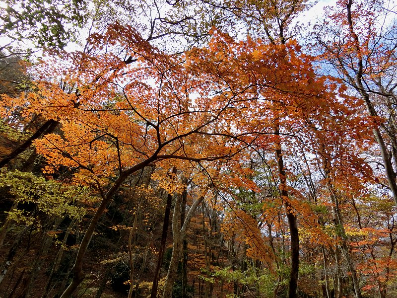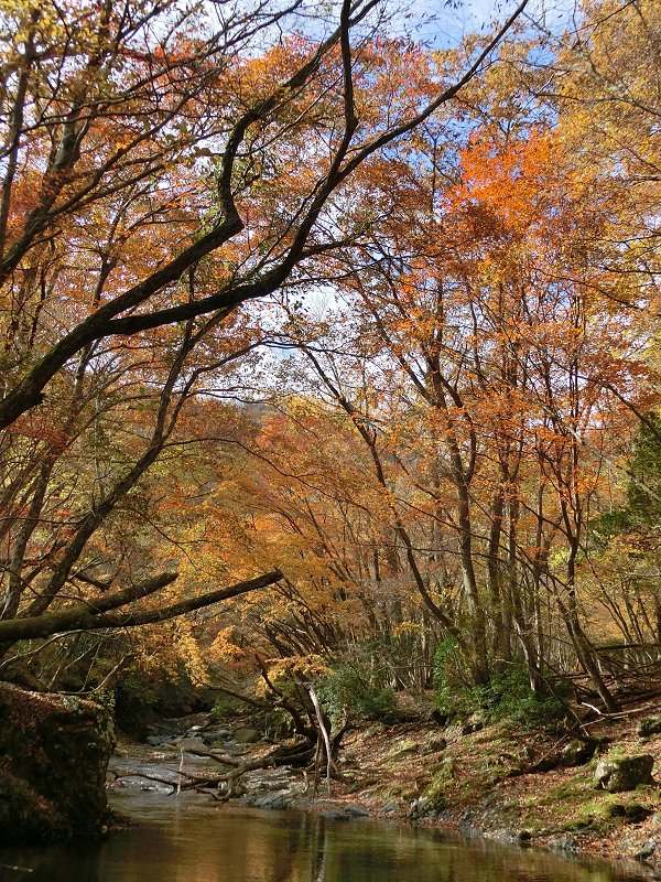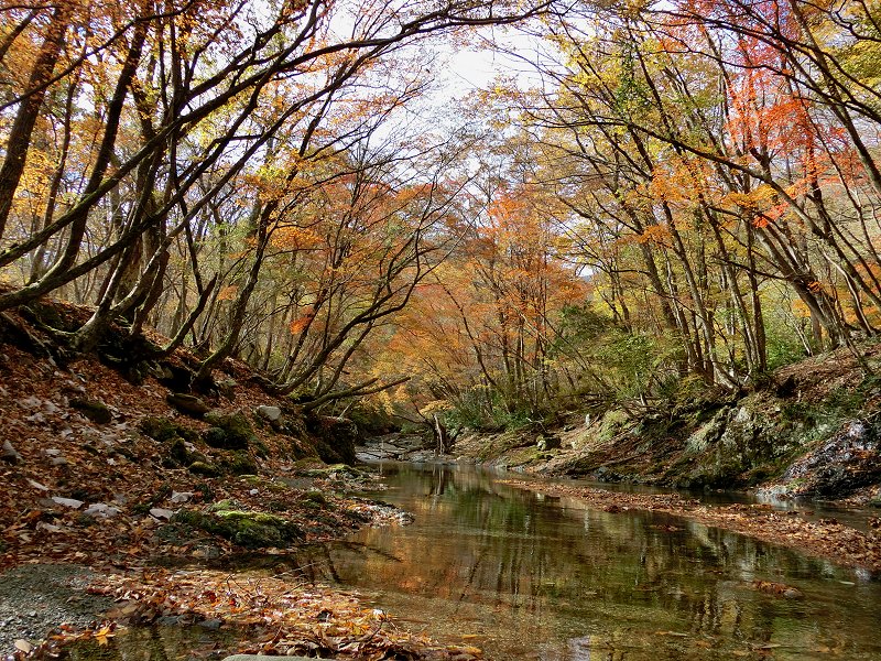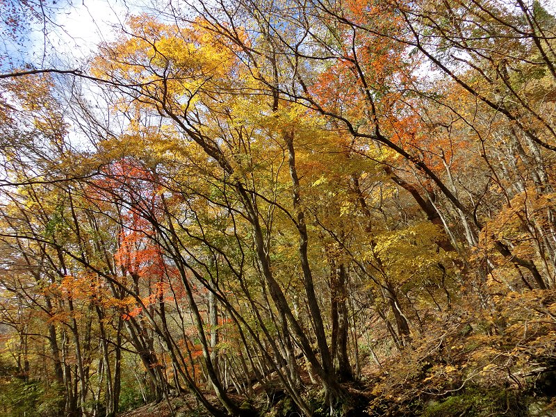 | 山の紅葉も標高1000m以下でも見れるようになり、暫く遠ざかっていた秋の鈴鹿へ・・・。 今回は紅葉時期には、まだ行ったことが無い、「鈴鹿の上高地」とも呼ばれている愛知川上流(神崎川)と、森が美しい「ブナ清水」の2ヶ所を廻ることにした。 紅葉の状況 根の平峠周辺では葉を落とした木多く、チョット遅かったかと思ったが、愛知川に近づくに従い、綺麗に色付いた木々が目立つようになった。幸なことに、両岸にはモミジ・カエデの類が多いようで、見事に色付いていた。 今シーズン一番の紅葉を見ることが出来た。 |